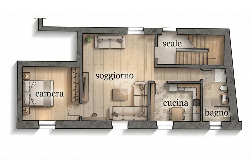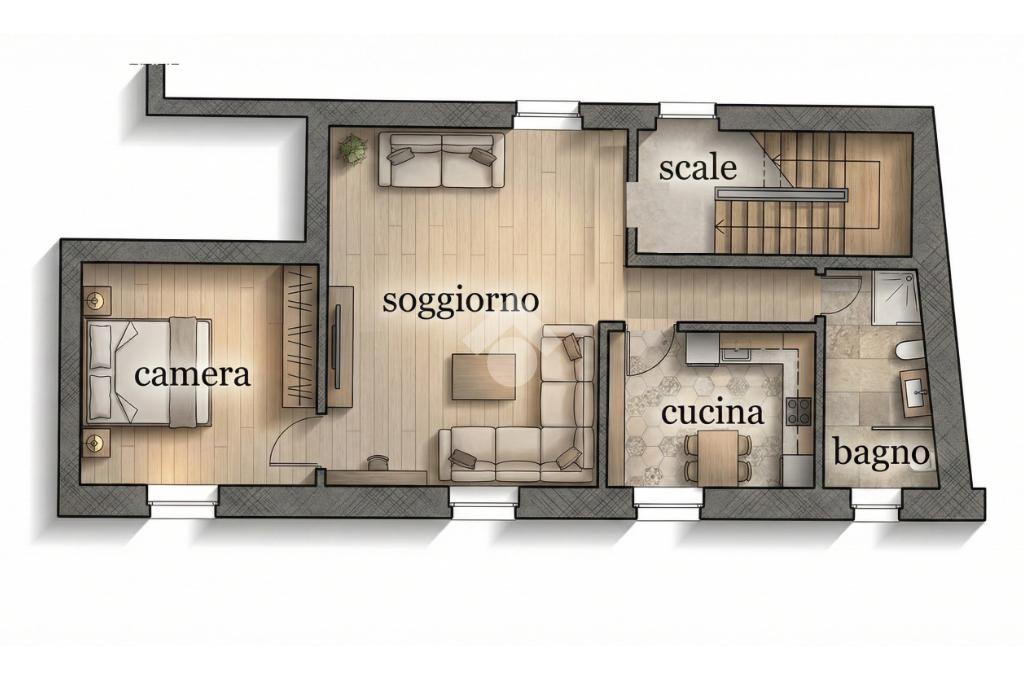 L’appartamento si trova al piano terra ed è composto da cucina abitabile open-space con un muro divisorio che divide la zona cottura dal soggiorno. La camera da letto è matrimoniale. Il bagno ha la doccia.