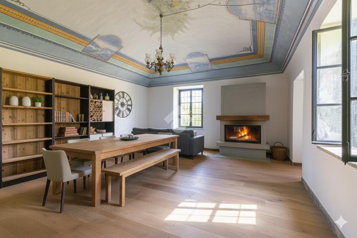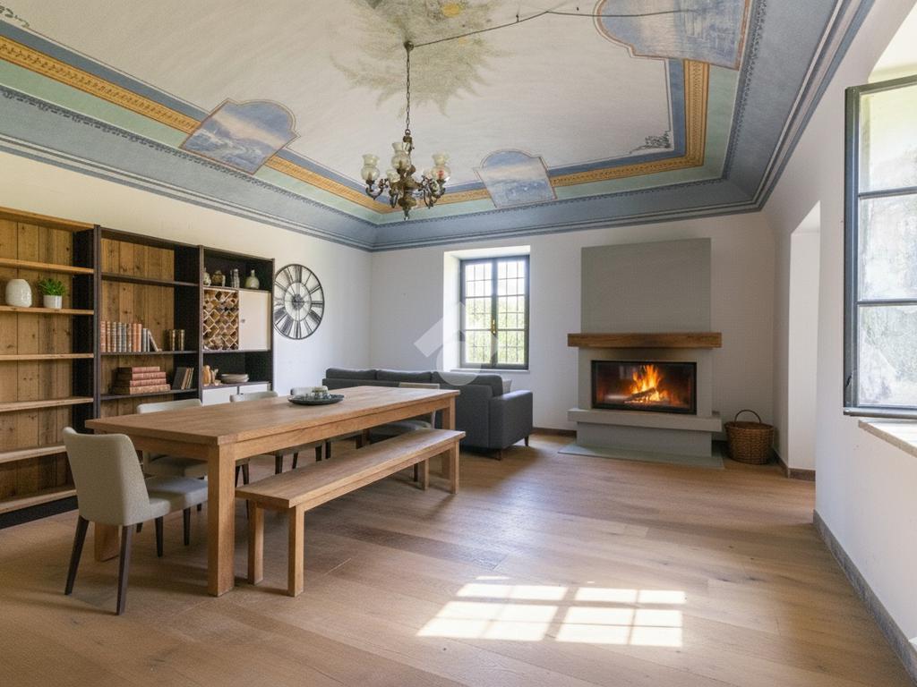 L'accesso può avvenire tramite due ingressi sul lato interno e il principale si affaccia sul piccolo vestibolo che unisce a sinistra, un ampio bagno dotato di doccia e finestra; di fronte la scala che porta al piano superiore e a destra la cucina. Questa è molto ampia ed è illuminata da due finestre. Inoltre ha una volta a padiglione e un caminetto. Successivamente troviamo il salotto decorato da affreschi nella volta e dotato anch'esso di caminetto. Inoltre abbiamo l'altro ingresso che da sul giardino.