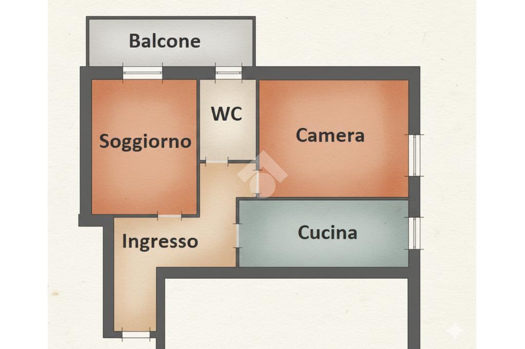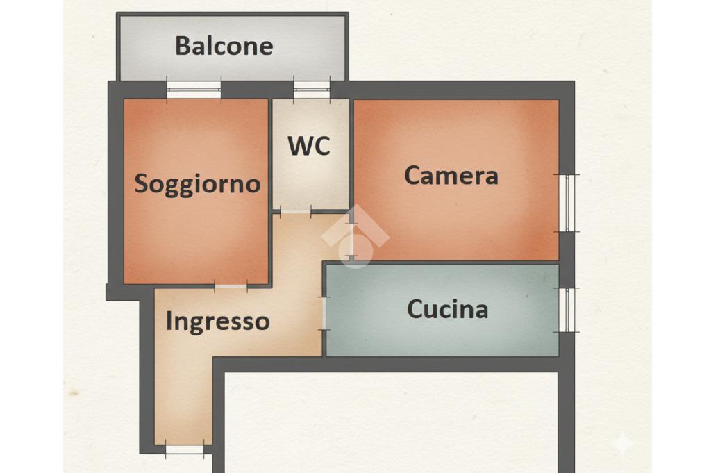 Il bilocale si trova all’interno di un condominio di medie dimensioni ed ha l’affaccio principale verso il cortile interno, garantendone una certa privacy nonostante sia al piano rialzato.