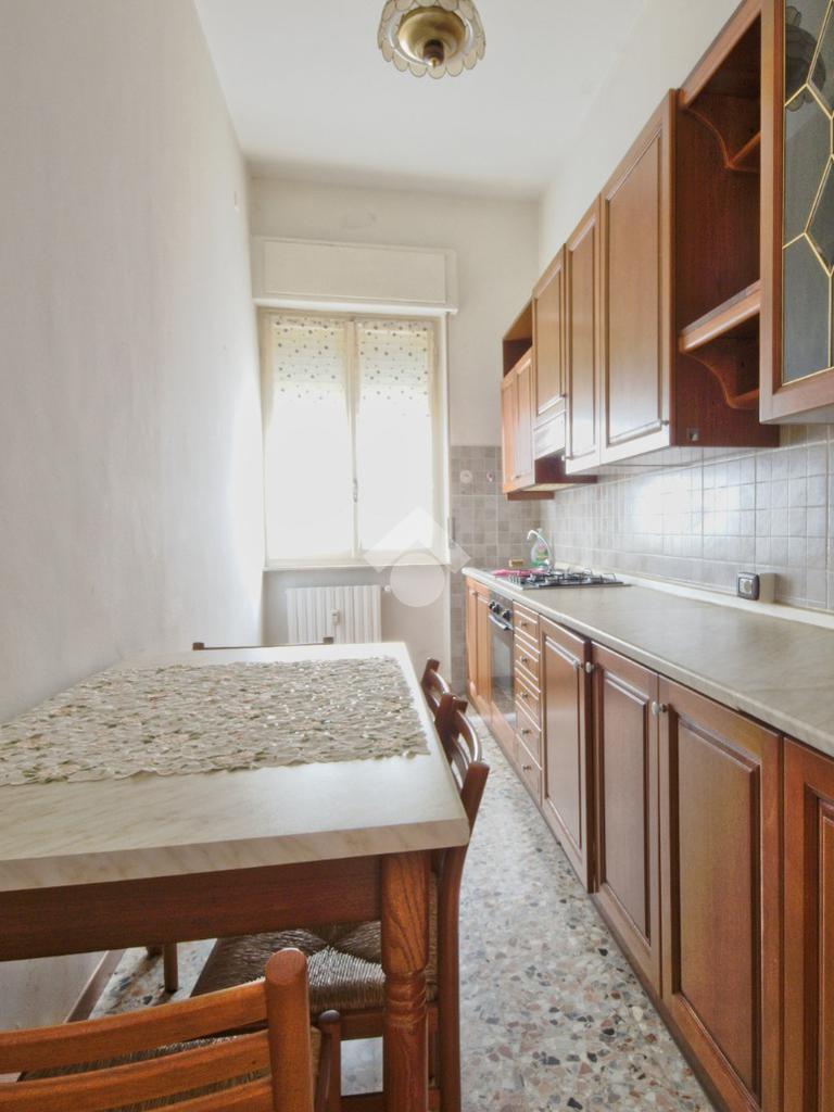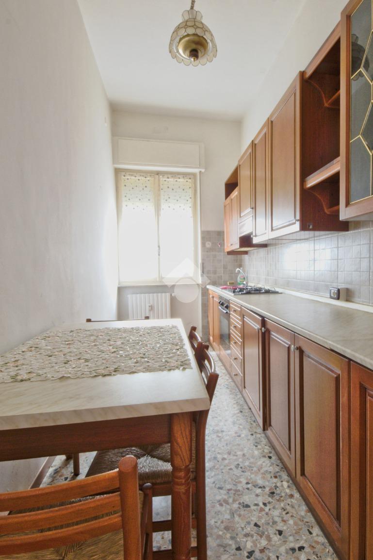 Dopo un ampio vestibolo a sinistra troviamo il salotto ammobiliato, con porta finestra e balcone. Proseguendo abbiamo la cucina arredata e dotata delle principali attrezzature per il suo funzionamento. La camera da letto è matrimoniale ed è molto spaziosa. Il bagno, ristrutturato nel 2000 è finestrato e dotato di doccia ed è presente l'attacco per la lavatrice.