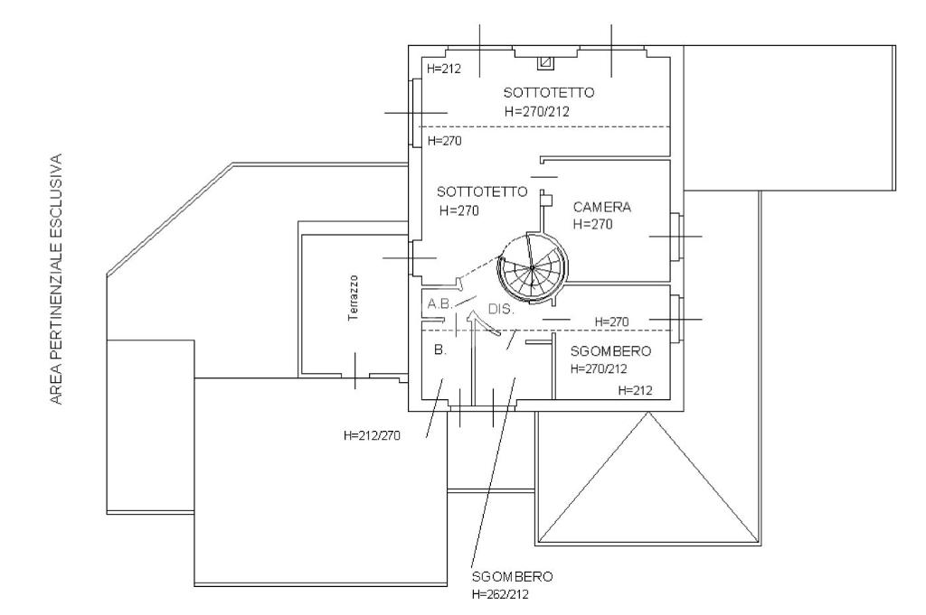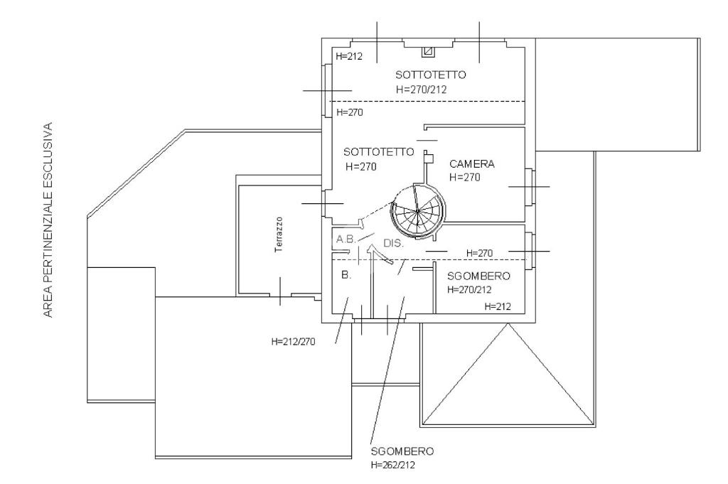 Il piano mansardato dispone di un ampio salotto, due camere da letto, una singola ed una matrimoniale, il bagno ed un piccolo cucinino. Va ad ultimare il piano il terrazzo di circa 15 mq.
