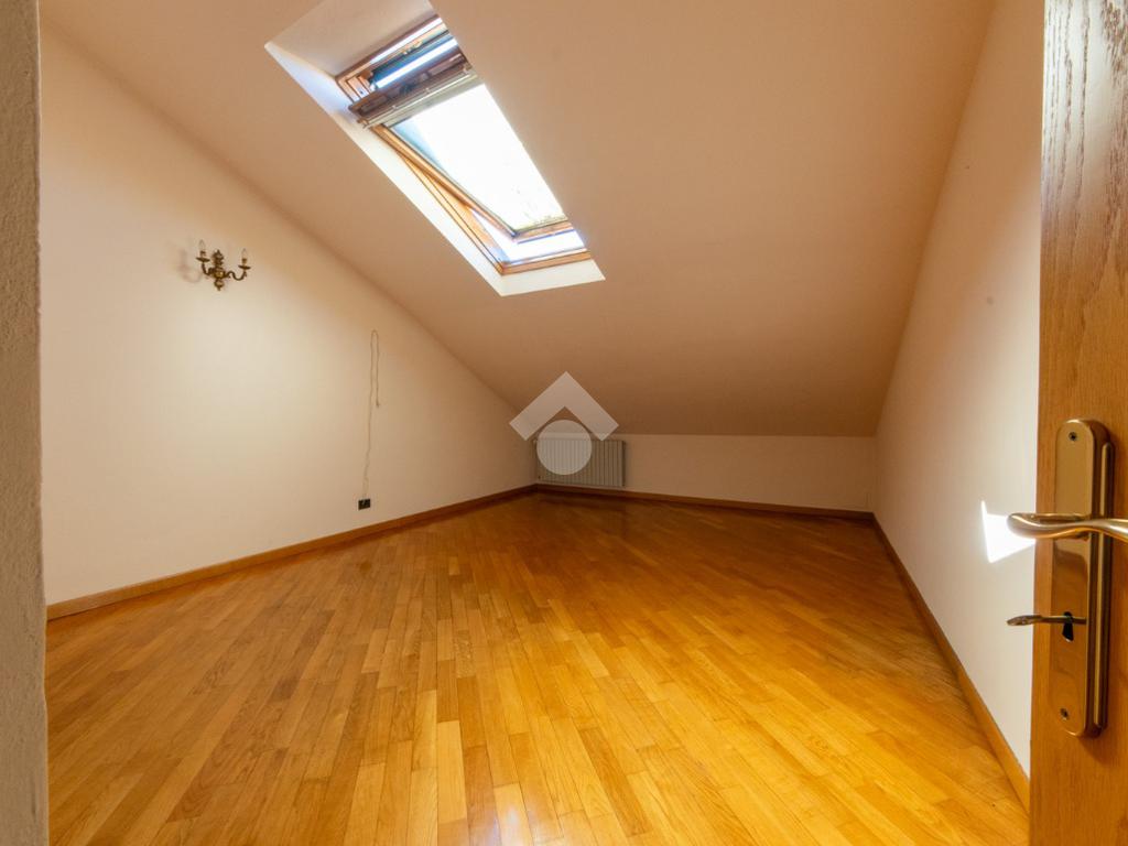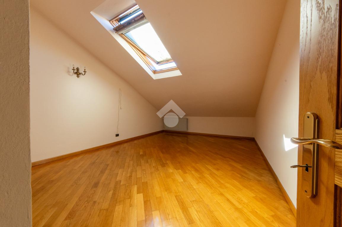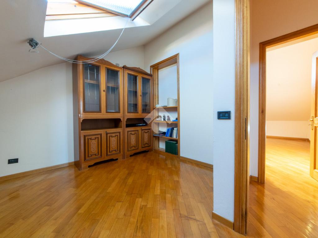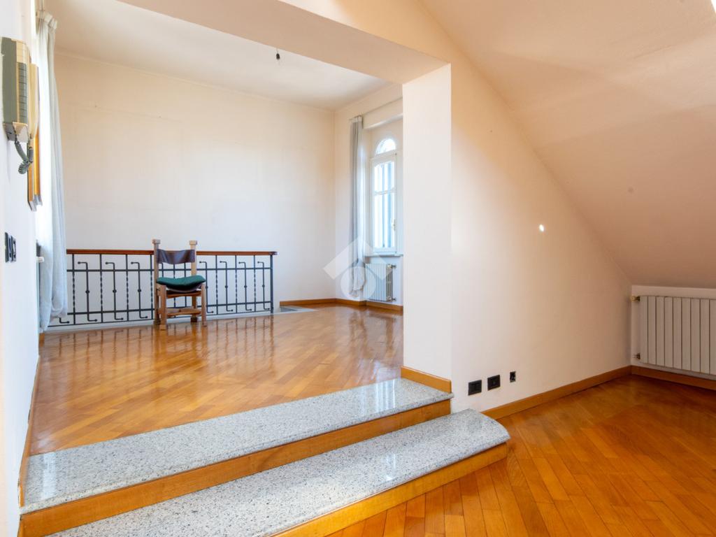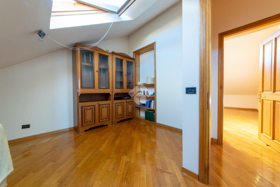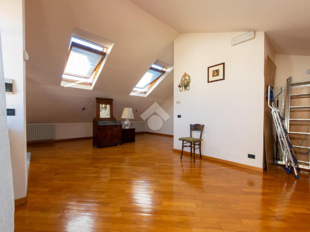 La scala interna in legno porta al terzo piano mansardato con pavimentazione in parquet, dove sono presenti un ampio ingresso utilizzabile come cucina/sala da pranzo, il soggiorno rialzato di ampie dimensioni, una camera da letto matrimoniale, ed una camera utilizzabile come singola o studiolo.