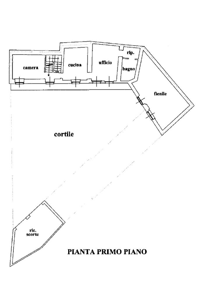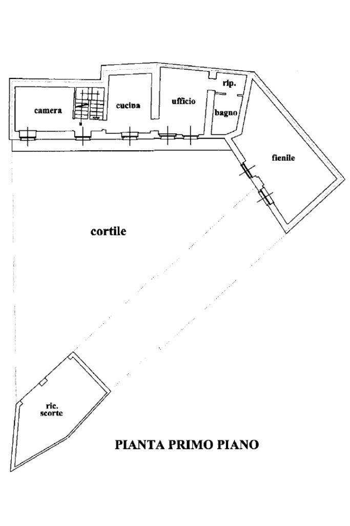 Il primo piano è composto da cucina, sala da pranzo e ampio soggiorno. In questo piano è inoltre presente il balcone che affaccia verso il cortile. Vanno ad ultimare il piano il ripostiglio ed il bagno con vasca.