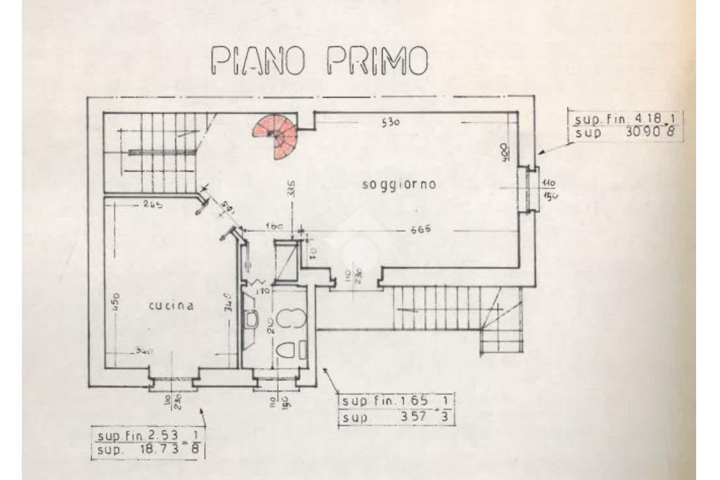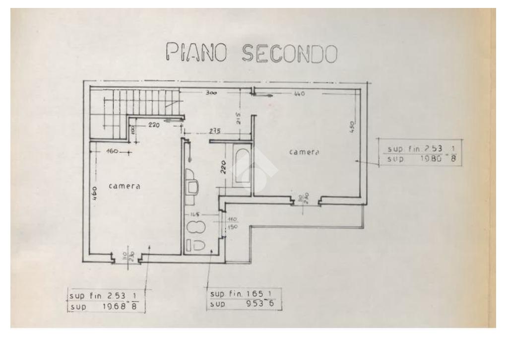 Il progetto originario prevede al piano primo un salotto e una cucina molto grandi, oltre che ad un bagno finestrato di servizio con antibagno. Al piano secondo abbiamo due camere da letto matrimoniali generose, il bagno finestrato con doccia e un balcone ad “elle”. Infine al piano strada abbiamo un’ampia cantina.