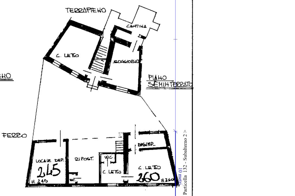 Sempre dal disimpegno d’ingresso si raggiunge il piano inferiore tramite una scala. Questo piano è composto da una camera da letto e da un soggiorno. È anche presente una cantina con pozzo.