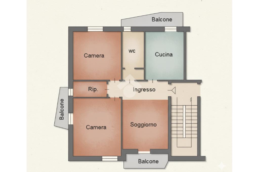 Le camere da letto sono due, entrambe matrimoniali. È presente un balcone. Va ad ultimare la proprietà la cantina.