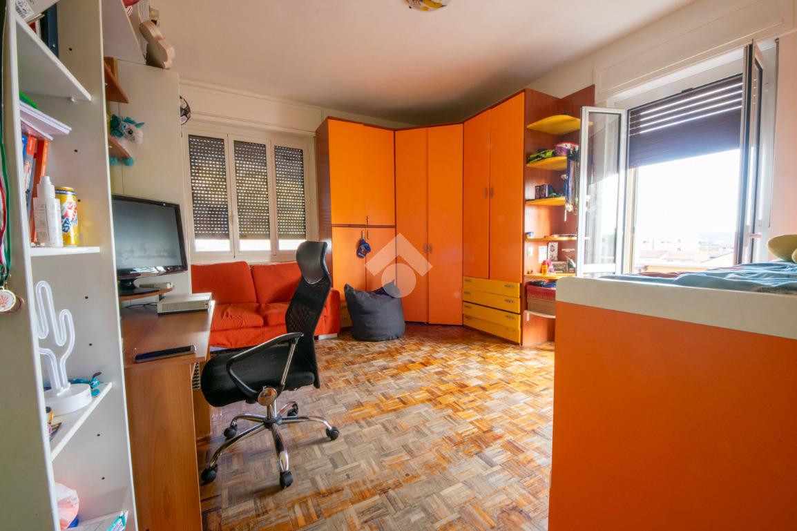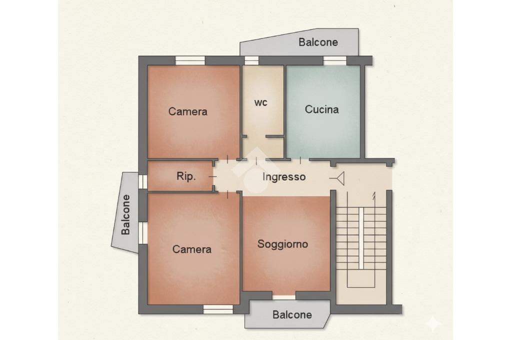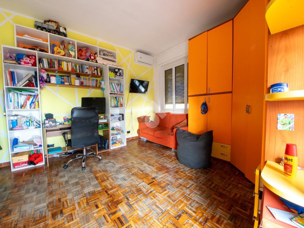 L’alloggio è ubicato al quarto piano di un condominio senza l’ascensore ed è composto da un ampio ingresso, che va a collegare tutte le stanze.